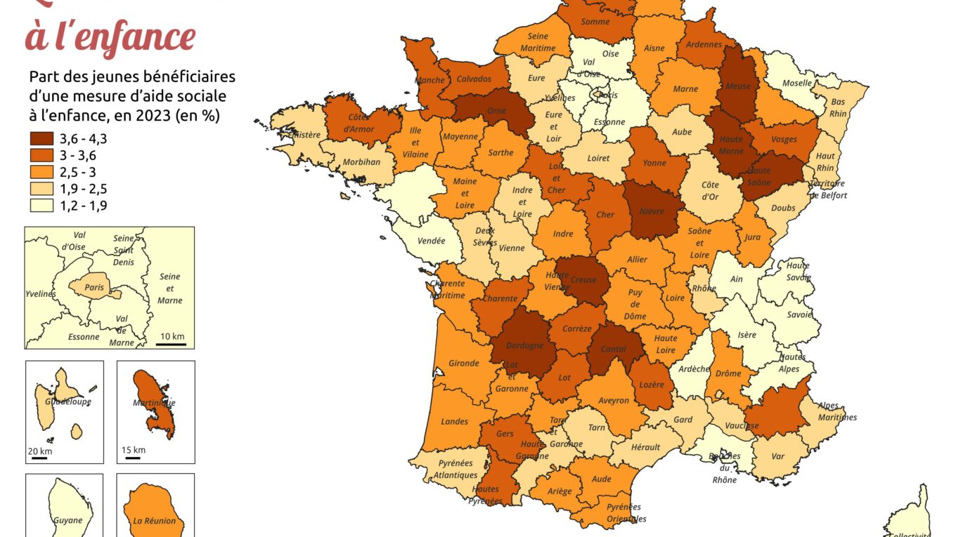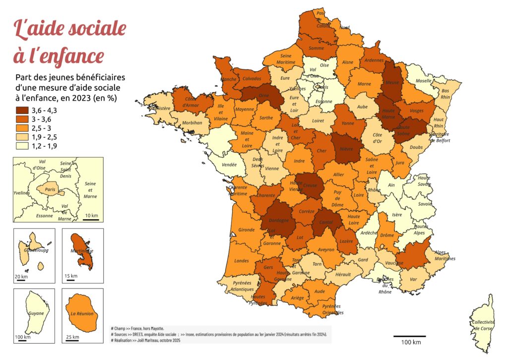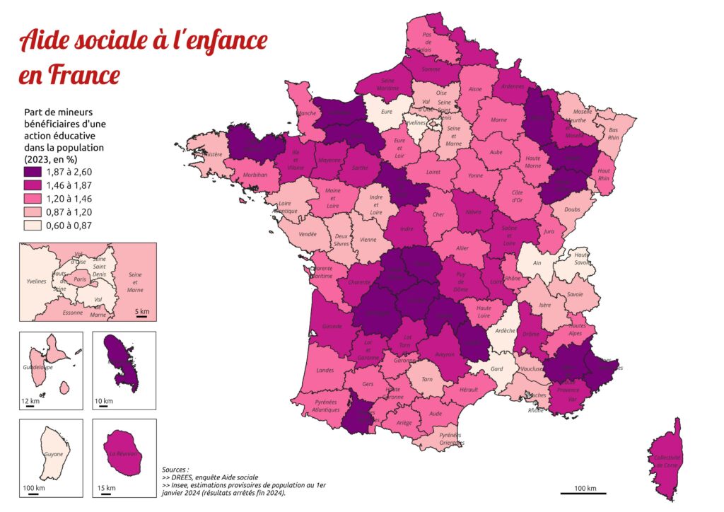 Quelques cartes et graphiques sur l’aide sociale à l’enfance à partir des données fournies par la DRESS et l’Insee pour 2023.